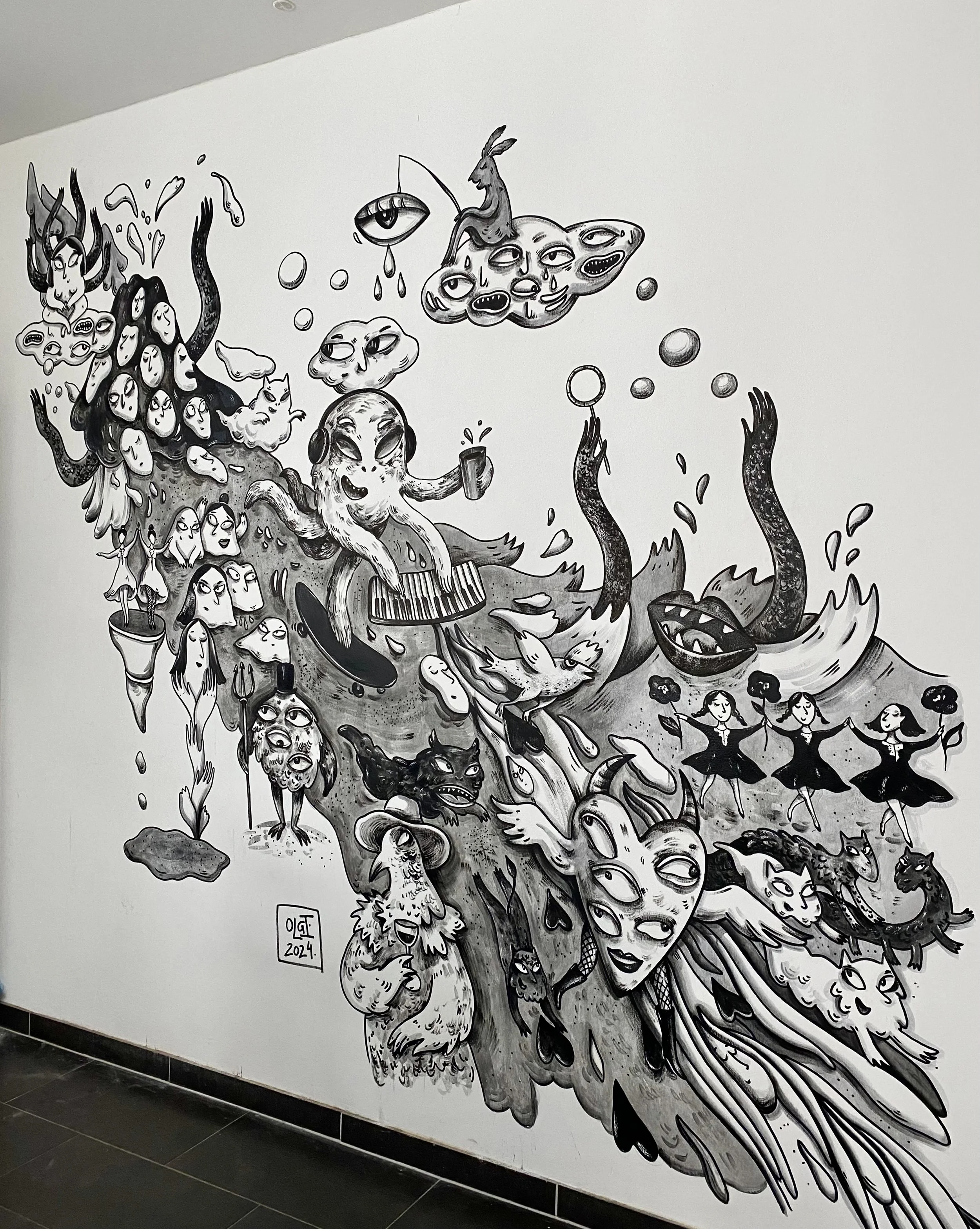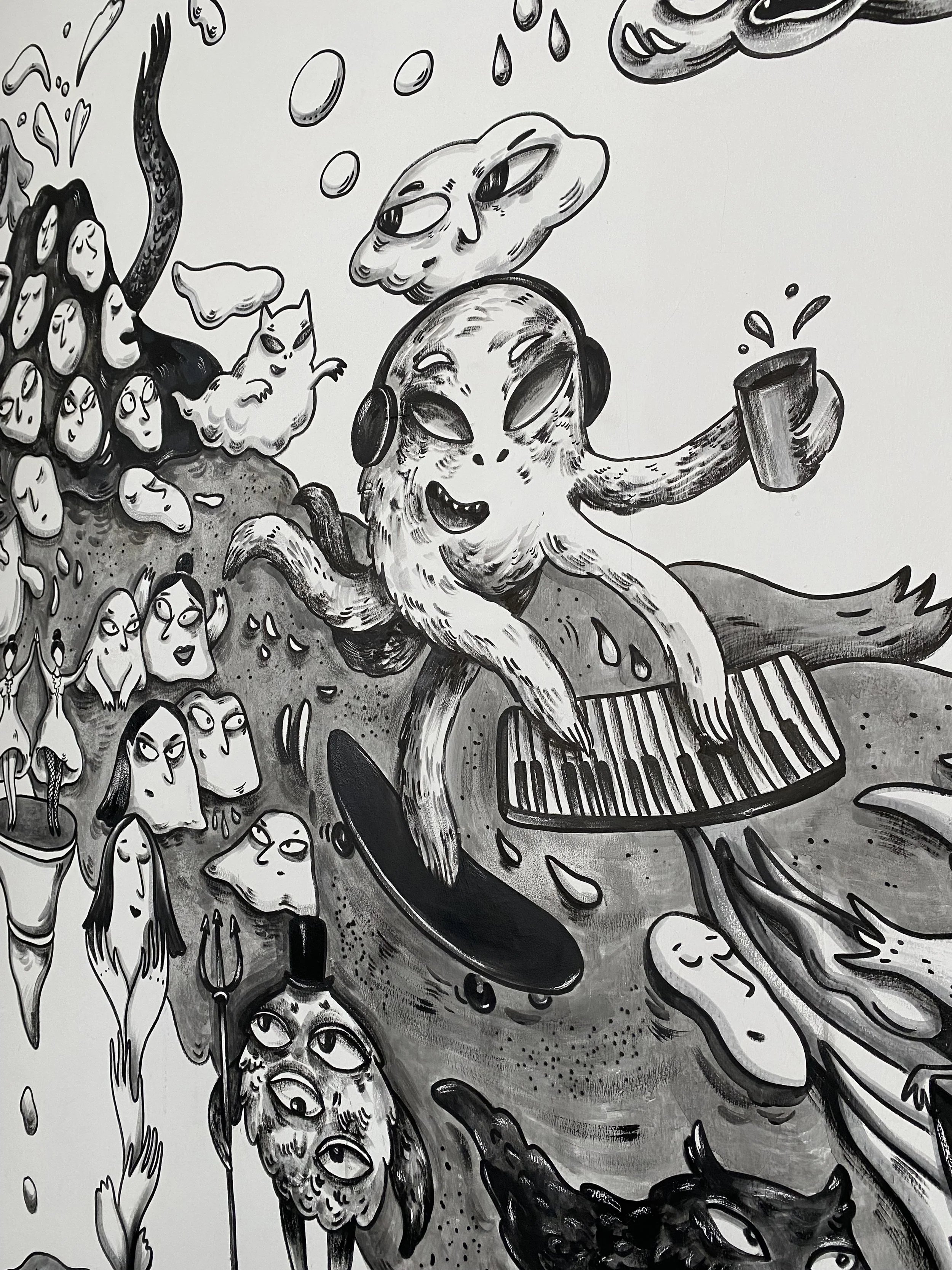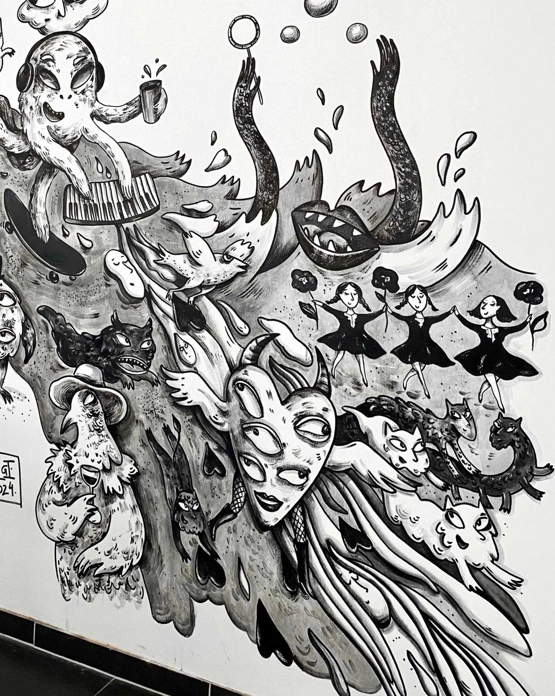 Private apartment / Berlin 2024 A mural created in a private apartment in Berlin in 2024, representing a stream of consciousness—the birth of ideas and the unexpected paths they may take. Request a quote